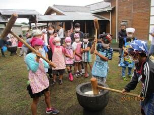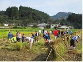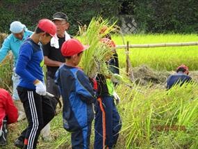 9月30日(月)に学校田の稲刈りを行いました。今回も峰区農用地管理組合の方、PTAの方の協力で手際よく進められました。2回目の6年生が5年生にアドバイスする場面も見られ、充実した時間になりました。長雨の影響か、量的には昨年度より少なく感じましたが、10月のもちつき大会が楽しみです。もち米販売も町民祭で行いますので、ご協力お願いします。