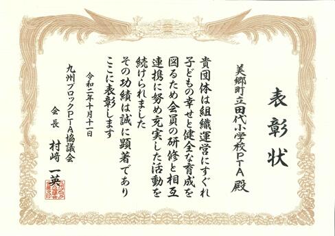 これまでの田代小学校PTA活動の実践、継続が認められ、本年度九州ブロックPTA協議会より表彰されました。本来ならば熊本で開催予定だった九州大会での表彰でしたが、残念ながらコロナの影響で紙面開催となりましたので、郵送という形になりました。現PTAの方はもちろん、これまでの諸先輩方に感謝したいと思います。ありがとうございました。