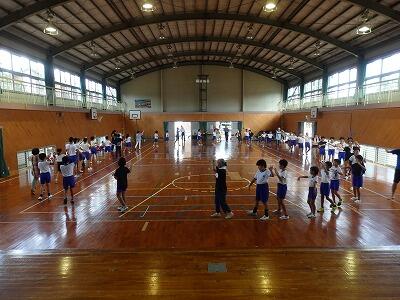 今日の6校時、体育館では4~6年による「田代盆踊り」の練習が行われました。運動会で披露すための練習です。この練習には、田代盆踊り保存会の皆さんに学校へおいでいただき、指導していただいています。CDをかけて練習をするのかと思ったら、なんと太鼓や三味線、そして唄まで生演奏でした。