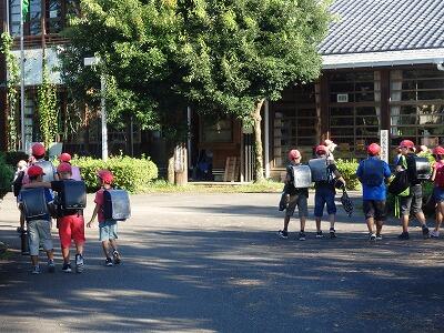 夏休み中に2回ほど登校日がありましたが、ランドセルを背負って登校するのは久しぶりです。友達と会うのも久しぶりだからでしょうか、子どもたちは正門を入った後、写真のようにかたまって、夏休みの思い出話等をしながら通過していったのが印象的でした。