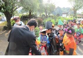 30日(金)に園児が製作の時間で作ったハロウィンの衣装を着て、お散歩に出かけました。小学校にもよって、園長先生からお菓子をもらって喜んでいました。他にも郵便局や西郷駐在所などを回りましたが、多くの人に声をかけていただきました。とても楽しいお散歩でした。