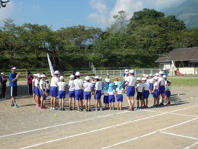 運動会は、幼小中の合同運動会です。結団式は1学期に行われていますが、今日は幼小の初めての合同練習だったので、「頑張ろう」の意味で、円陣を組み、かけ声を出しました。