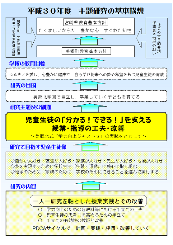 今回は、先日行われた宮崎県研究主任連絡協議会(主催:宮崎県教育委員会)に参加した研究主任から、宮崎県の方針を踏まえた本年度の研究基本方針が示されました。キーワードは「授業改善」「職員全員で取り組めるテーマ」で、一般的に教科等で研究を進めにくい中学校の先生方に対応して、「一人一研究」を行うことを確認しました。