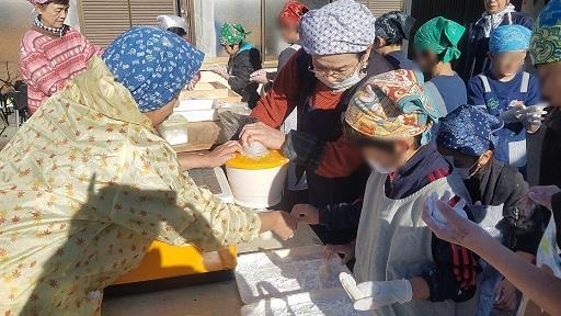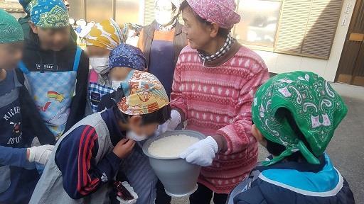 12月13日(水)に甲斐栄様方にてもちつきを行いました。田植えから稲刈り、脱穀まで体験させていただいてきましたが、今回は刈った稲でもちを作りました。毎回のことながら今回も甲斐様ご夫妻をはじめ多くの方に「先生」として子どもたちにご指導いただきました。