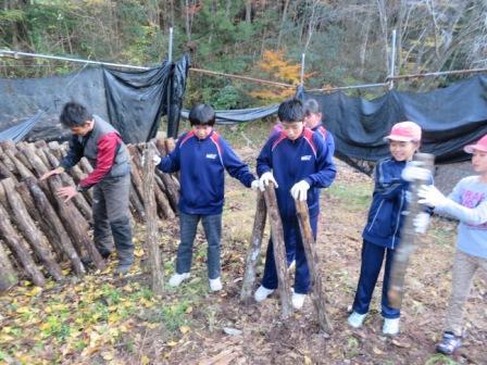 11月28日(火)、5年生と7年生(中学1年生)でシイタケのほだ木組みを行いました。地域の林業研究グループの方々も協力してくださいました。