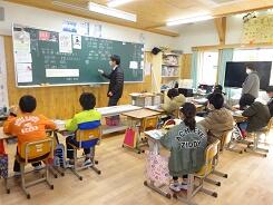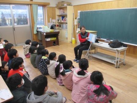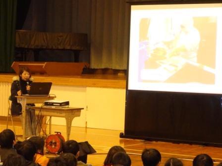 昼休みを使って、幾つかの教室に分かれて実施しました。たくさんの子どもたちが参加し、話に聞き入っていました。