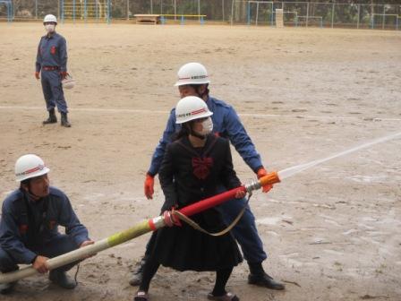 運動場に避難後は、学園生の代表数名が、消火器と放水の体験をさせていただきました。