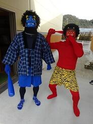 赤鬼と青鬼に扮しているのは、事務職員の日髙元喜先生と中学部教員の松山智洋先生。授業の空き時間や業務の合間の貴重な時間を使って幼稚園や小学部の子どもたちのために一肌脱いでくださったようです。これまでにも、様々な場面で学校生活を豊かにしてくださっています。(一歩間違えると不審者扱いされそうですが・・・事前に職員には知らされていたので、驚いたのは子どもたちだけでした。)