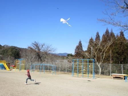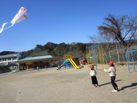 子どもたちはうれしそうに自慢の凧を揚げていました。昔ながらの遊びに触れるよい機会になりました。少人数の学校ならではの取組です。