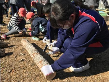 2月6日、3・5・7年生の子どもたちが椎茸のコマ打ちを体験をしました。地域の林業研究グループの皆様のご指導のもと、原木にドリルで穴をあけ、椎茸の種ゴマを打ち込む作業を行いました。