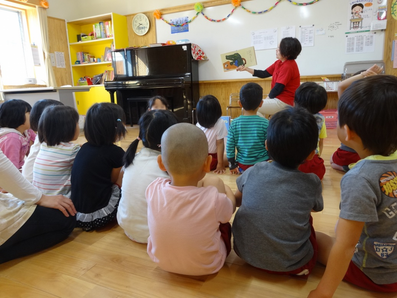 写真は「わにわにのごちそう」という本を読んでいるところです。全部で8冊読んでいただきました。園児たちは繰り返しのある本などとても楽しそうにのってきました。
