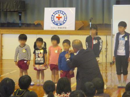 5月17日の1校時、JRC登録式が実施されました。日本赤十字社宮崎支部の方や地域の赤十字奉仕団の方が来校され、JRCバッジの授与や講話をしていただきました。