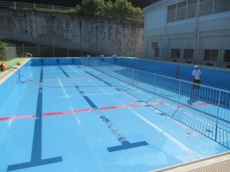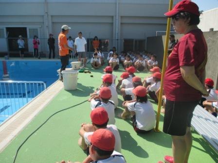 清掃終了後に、校長先生からのお話がありました。今日の子どもたちのがんばりへのねぎらいと、「”古い”と”汚れている”は同じではない。京都や奈良にあるお寺は、千年前からあるが、とてもきれいに保たれている。このプールも、いつまでもきれいに保っていこう。」というメッセージをいただきました。今シーズンはもちろんですが、何年経ってもきれいなプールであるよう、みんなで大切に使っていきたいと思います。