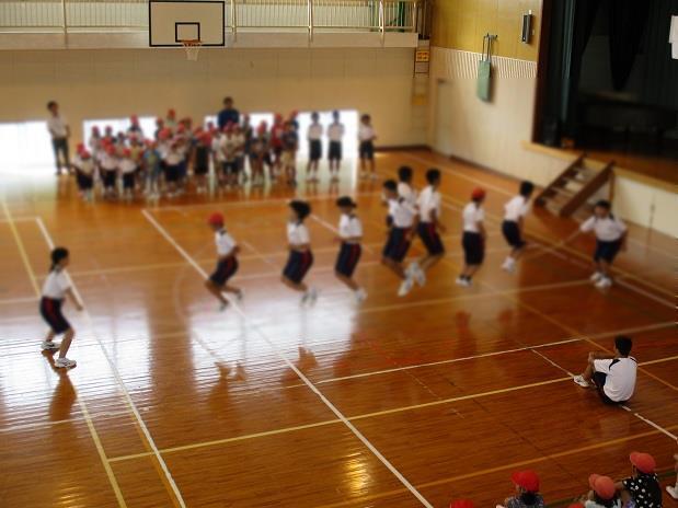 今日は、縦割り班で縄跳びに取り組みました。子どもたちは、異学年の友達と一緒にいろいろな技に挑戦しているところです。