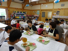 みんなニコニコ顔です。配膳や後片付けがしやすいように、メニューにも心配りがしてあります。もちろん全員いつもより早く「完食」でした。委員会の皆さん、担当の先生方、いつものことながら温かい心配りをありがとうございます。参加したみんなの笑顔がお礼の印です。