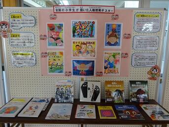 人権ポスターや人権に関する図書が掲示されています。技術員の徳田先生のアイデアがつまった掲示です。子どもたちは、登下校の際にじっと見入っています。