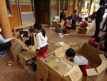 よく見ると、小学生と幼稚園生が一緒になって段ボールでつくった迷路や隠れ家で遊んでいます。じつはこれ、2年生が図工「だんだんダンボール」で作成した立派な作品。思い思いのアイデアで作られた作品がつながって、いつの間にか巨大なものになっていました。子どもたちがこれを見逃すはずはありません。昼休みを待って、他の学年や幼稚園生が大挙して遊びに参加したようです。下級生に丁寧に遊び方を教える2年生の姿も頼もしく感じました。わざわざ打ち合わせをしたり特設の機会を設けなくても、こうして自然にかかわり合える環境があることは、これからも大切にしていかなければなりません。