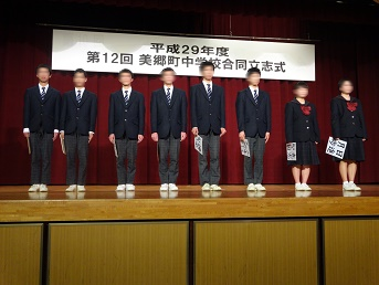 6日(火)、南郷多目的センターにて「第12回美郷町中学校合同立志式」が厳かな雰囲気の中で挙行されました。これは、町内の3中学校(西郷中、美郷南学園、美郷北学園)の8年生(中学2年生)が一堂に会して行う式です。長尾勇教育長のご挨拶の後、立志証書授与(代表 齊藤丈留さん)、来賓祝辞と進み、出席した生徒全員による決意表明がありました。