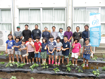 18日(月)、JA日向北郷青年部の皆さんのご協力をいただいて、今年も2年生が「さつまいもの苗」を植えました。生活科の授業の一環です。前日の天気が心配だったことから、畑は15日(金)に耕してくださいました。毎年のことながら、この時期は田植えなどそれぞれがお忙しいにもかかわらず、貴重な時間を割いて子どもたちの体験活動にご協力いただいています。今回も9名の方が来てくださいました。