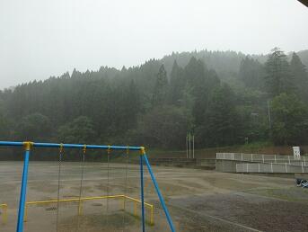 運動場は大きな川が流れているかのようです。学校敷地のとなりを流れる五十鈴川もこれまで見たこともないような濁流であふれています。学校はとても静かですが、雨と風の音が不気味です。子どもたちの家に被害が出ないように祈るばかりです。