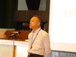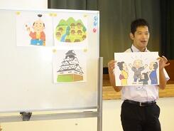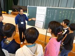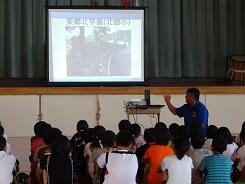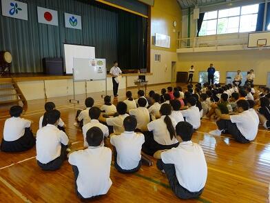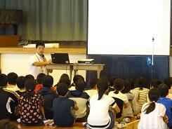 社会科がご専門の岡崎教頭先生は、今年度宮崎県の指定を受けて中学部を中心に取り組んだ地域に貢献する環境学習についてお話しされました。地域の竹を使った竹灯ろうやオリジナルのゴミ袋を製作したこと、夏祭りでの環境ボランティアへの取組などを紹介して、その成果を伝えてくださいました。子どもたちは真剣に話を聞き、環境問題への意識を高めたようでした。