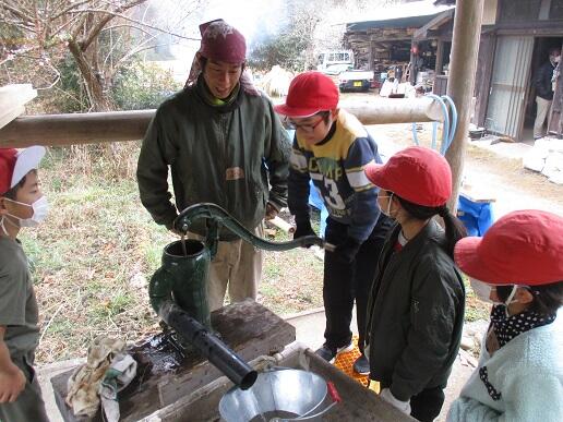 井戸水くみ班は、ポンプに苦戦しながら五右衛門風呂に溜める水をせかせかと運びました。地下7mからくみ上げられる水はすこし温かく感じ、水道水ではないところから出てくる水に児童も興味を示していました。