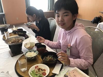 | 麦ごはん、豚肉の生姜炒め、スナップえんどうのマリネ、豆腐とあおさのスープ |