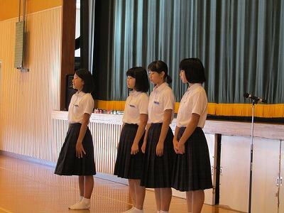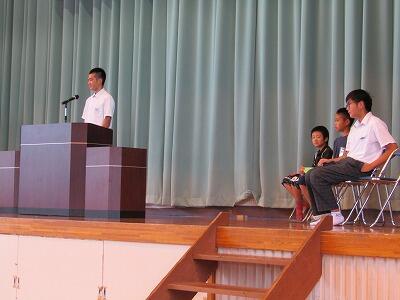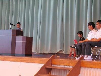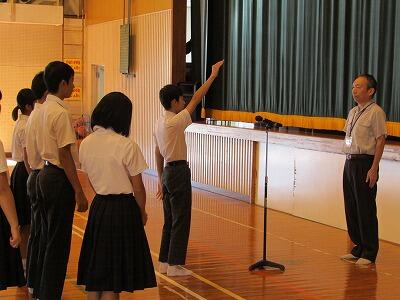 | 9月25日(水) 今日は、東臼杵地区中学校秋季体育大会の推戴式が行われました。はじめに、男女ソフトテニス部と陸上部から決意表明がありました。次に、学園生を代表して9年生が激励の言葉を送りました。校長先生のお話の後に、力強い選手宣誓、そして、学園生からのエールが送られました。大会は、ソフトテニス競技が9月28日(土)、陸上競技が9月29日(日)を予定しています。これまでの練習の成果を発揮して、精一杯頑張ってくれることを期待しています。 | |