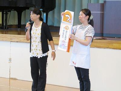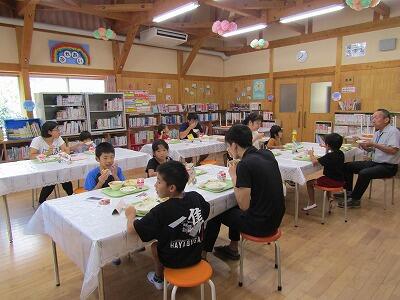 | | 今日は、8、9月のバースデー給食が行われました。8、9月が誕生月の幼稚園、小学部、中学部、先生方がふれあい教室に集まり、一緒に給食をいただきます。特別にデザートがついています。保体委員の学園生が、この日のためにいろいろ準備をしたり、司会進行やイズ大会を行ったりしました。みんな、会話をしながら楽しい時間を過ごしていました。 |