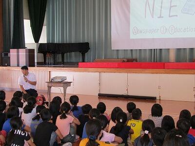 | | 9月19日(木) 今日は、全校集会が行われました。はじめに、サイエンスコンクール審査員特別賞と東九州ジュニアサッカー大会の表彰が行われました。次にNIEの取組についての説明がありました。NIEとは学校等で新聞を教材として活用し、興味や関心の幅を広げる取組です。学園では、幼稚園から中学部まで、発達段階に応じた活用を図っています。 |
