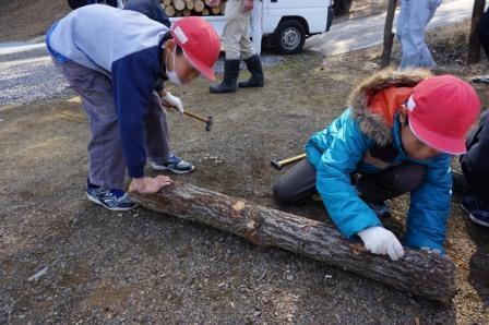 その椎茸の菌床(駒)を原木に打ち込む作業を、北郷区林研グループの方々が教えてくださいました。