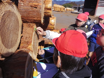 子どもたちは原木の年輪を数えたり、においを嗅いだりととても興味津々!