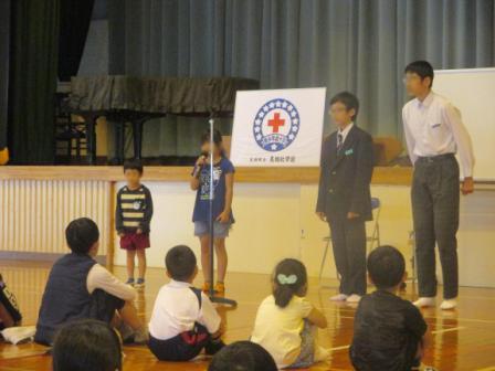 赤十字の方の講話では、赤十字がスイス発祥であることや、みんなのために自分ができることを進んで行うことの素晴らしさについてお話をしていただきました。