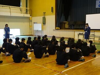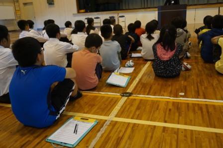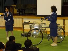 天気があいにくの雨でしたので、体育館で教材DVDを視聴した後、宮崎県の交通事故の状況や自転車の正しい点検の仕方について教えていただきました。