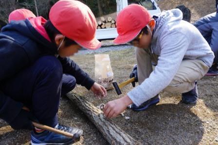 2月7日に3年、5年、7年生が椎茸の駒打ち体験を行いました。