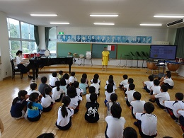 今日9月6日(火)は、月1回のブロック別集会の日。前期ブロック(1~4年生)は、毎月先生方からのお話をしていただいています。今日は音楽専科のY先生の順番です。