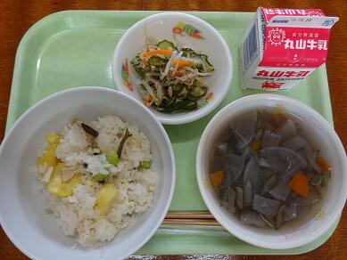【じとっこの炊き込みごはん 牛乳 きびなごフライ スナップえんどうのマリネ あおさ汁】