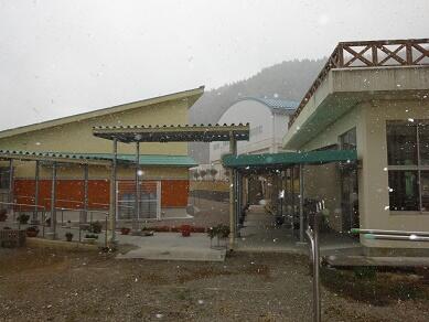 写真は、運動場から見た校舎と体育館です。体育館は学校施設はと思えないほど立派です。今なおバドミントンやバレーボールなど地区住民の大切な活動の場となっています。右側の校舎は、階段を昇った少し高い場所にあるユニークなつくりで、プールをはさんだ中庭には飛行機をかたどった遊具もあります。校舎は、宿泊施設を含め今後の活用が検討されているようです。