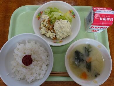 麦ごはん 牛乳 チキン南蛮 うめぼし キャベツ 新タマネギのみそ汁