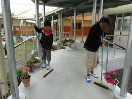 朝、登校した子どもたちから順に箒を手に手に教室前の廊下や渡り廊下、玄関先をはいたり、ペットボトルに水を汲み植木鉢やプランターの花に散水したりと、自分にできるボランティアに取り組みます。個人の時間がなかなかとれない中で、子どもたちには定着してきた活動です。キャリア教育を標榜する本学園では、勤労精神も大切に育てたいと考えています。