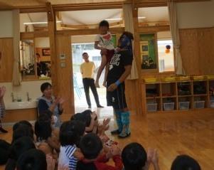 10月20日(木)、九州プロレスに所属する佐々木日田丸選手が北郷幼稚園に来園し、幼児と交流しました。