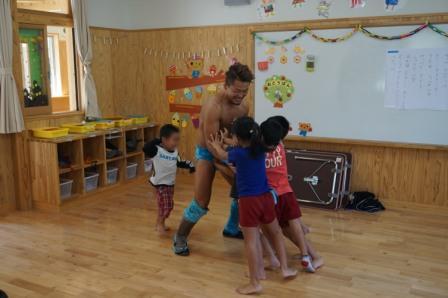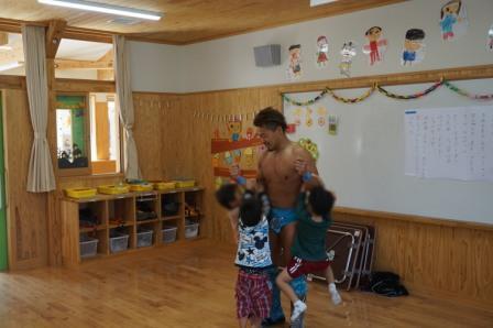 相撲で対決!幼稚園児のパワーに日田丸選手も圧倒されていました。