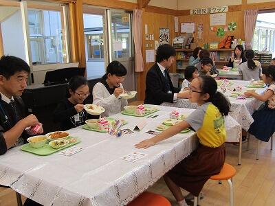 | | 今日は、10・11月のバースデー給食が行われました。10・11月が誕生月の学園生と先生方がふれあい教室に集まり、一緒に給食をいただきます。特別にデザートがついています。保体委員の学園生が、この日のためにいろいろ準備をしたり、司会進行やイズ大会を行ったりしました。みんな、会話をしながら楽しい時間を過ごしていました。 |