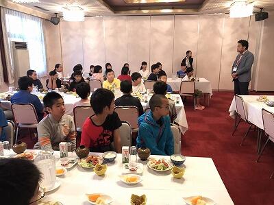 | チキンライス、卵とコーンのスープ、フルーツサラダ |