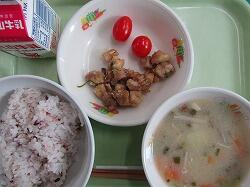 | 雑穀ごはん、鶏肉の白ねぎソースがけ、なめこ汁 |