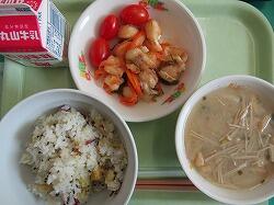 | 麦ごはん、鶏肉とカシューナッツ炒め、もずく汁 |