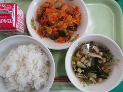 | 麦ごはん、豚肉と 白菜のピリ辛炒め、にら玉スープ |