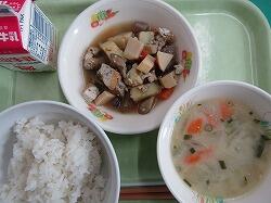 | 麦ごはん、里芋のそぼろ煮、きゅうりの酢の物 |