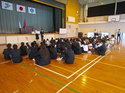 4月23日(火) 今日は体育館で全学園生が集まりJRC集会が行われました。写真は、校長先生から幼稚園「ほし組」の園児たちへの徽章の贈呈の様子と、生徒会によるJRC活動の説明の様子です。