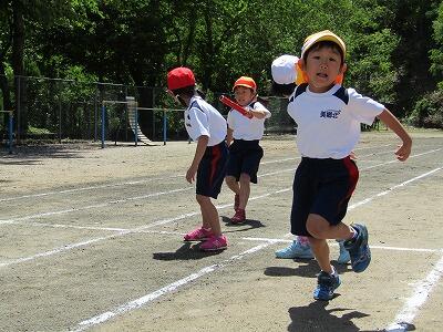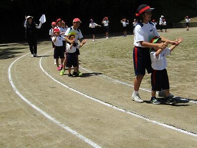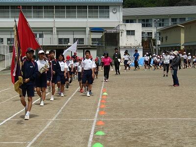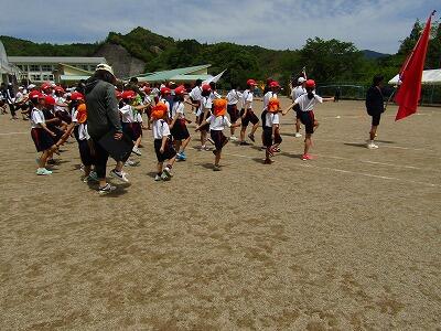 | 5月10日(金) 今日は、運動会へ向けた全体練習がありました。初めての全体練習です。開会式、行進の練習をしました。5月のさわやかな風が吹く中、大きな歌声が山々に響いていました。写真は、行進の練習をしている様子です。幼稚園生も一緒に頑張っています。 |